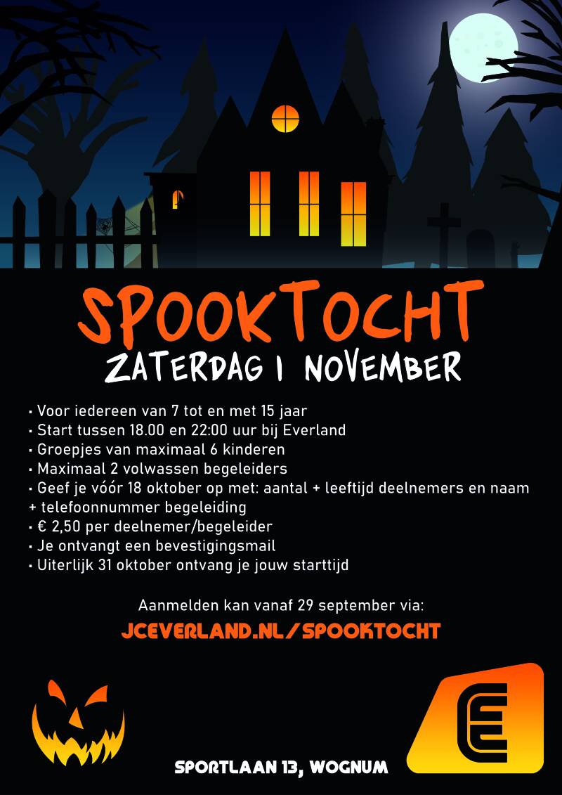 Voor kinderen van 7 t/m 15 jaar en start vanaf 18:00 bij JC Everland. Je kunt je opgeven met een groepje van maximaal 6 deelnemers en 1 of maximaal 2 begeleiders. Je kunt je tot zaterdag 18 oktober aanmelden via het formulier hieronder. Je ontvangt van ons een bevestigingsmail en uiterlijk vrijdag 31 oktober ontvang je jouw starttijd. Deelname bedraagt €2,50 per deelnemer/begeleider.